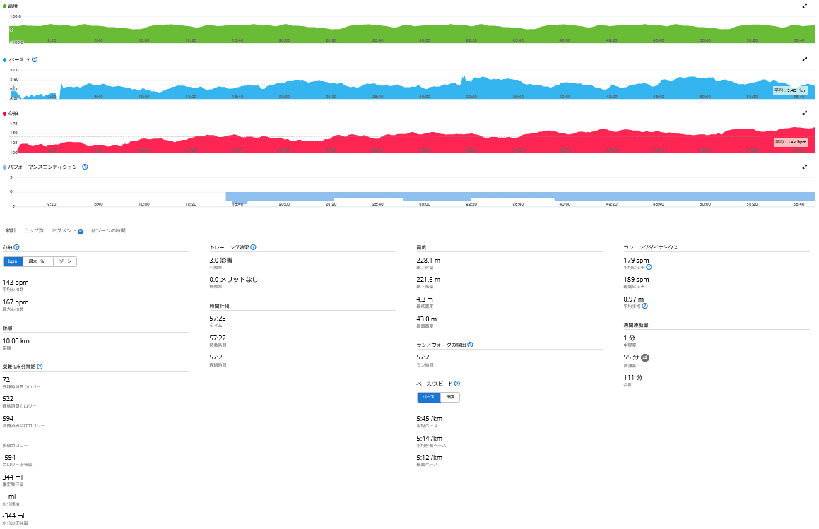 今朝はゆるjog10 km(57'25)。